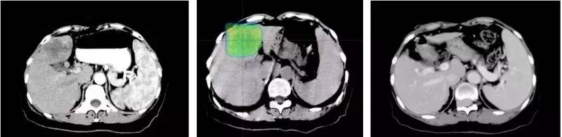 右:质子治疗九年后复查图像:肝右叶肿瘤消失