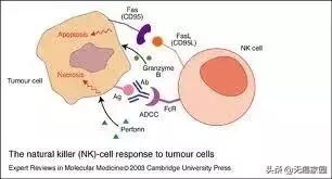 活化NK细胞表达Fas(CD95)配体和TRAIL(TNF related apoptosis inducing ligand,肿瘤坏死因子相关诱导凋亡配体)分子,诱导CD95+靶细胞和TRAIL受体阳性的靶细胞通过内源酶的级联反应发生凋亡,使靶细胞进入程序性凋亡状态。