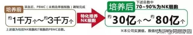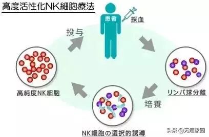为了提高体内NK细胞的活性及数量,日本的科学家发明了一种亿万倍增法,是从人体血液当中抽取50ml,把极少量的NK细胞分离出来再扩增培养,使其数量增加到原来的1000倍,数量达到10亿-50亿个,再回输体内,大量的NK细胞会随着血液全身循环3000次到4000次,把体内的癌细胞,老化细胞,病变细胞,细菌病毒等杀灭一遍,从而达到防癌抗癌,提升免疫力,延长生存期的目的。