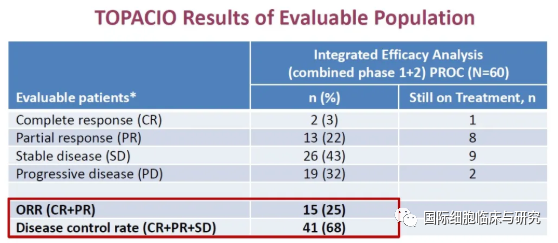 在60例可评估的患者中,客观缓解率(ORR)为25%,其中包括2例完全缓解(CR)的患者;疾病控制率(DCR)为68%;疗效持续时间的数据尚未成熟。