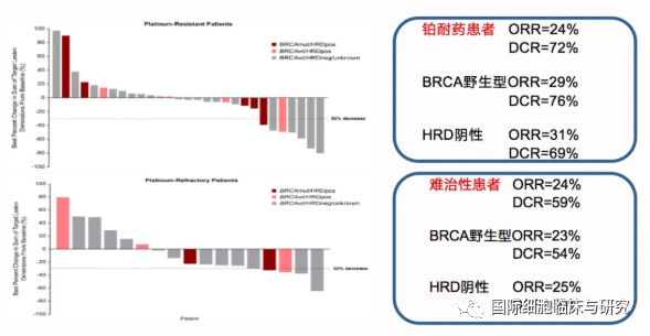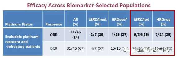 患者的疗效与标志物的状态无关,针对46例生物标志物选择患者的分析发现,联合疗法在BRCA突变患者中的ORR约为29%(2/7),同源重组缺陷(HRD)阳性患者27%(4/15),BRCA野生型患者为26%(9/34),HRD阴性患者29%(7/24)。