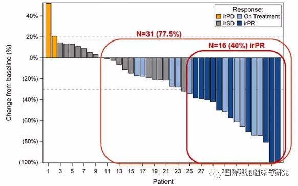 三个月后CT进行的评估显示,有4例患者有部分缓解,8例疾病稳定,1例进展。