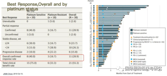 中位反应持续时间为6个月,中位无进展生存期(PFS)为8.1个月;与铂类敏感患者相比,铂类耐药的患者的中位反应持续时间更长(12.3个月VS5.6个月),但中位无进展生存期较短(5.3个月VS9.4个月)。