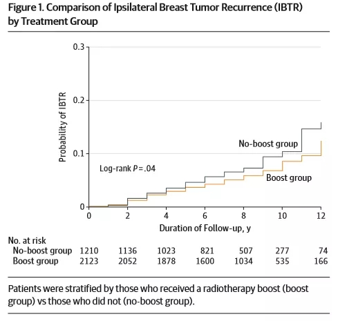 一项关于1980年1月~2010年12月单纯导管原位癌(无微浸润)进行保乳手术并接受全乳放疗后用或未用加量放疗的回顾性研究,选取了4131例患者作为研究对象,其中加量放疗组2661例,未加量放疗组1470例。中位随访9年,中位加量14 Gy,观察其乳腺癌复发率。