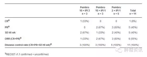 1.perbrolizumab 联合ipilimumab作为晚期非小细胞肺癌二线用药的临床一期实验:在所有11名疗程超过6周的受试患者中,给药剂量不同,疾病控制率均为100%,其中完全缓解1人(9%),部分缓解5人(45%)。