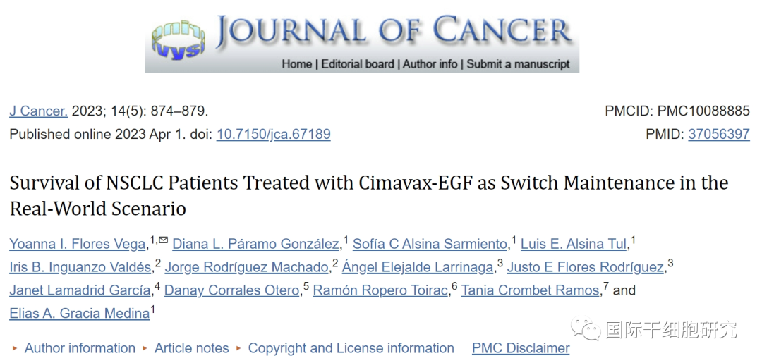 2023年《癌症杂志》发表了“Cimavax-EGF肺癌疫苗治疗晚期非小细胞肺癌”的临床研究数据。该研究选取106例成年NSCLC患者(一线治疗后,病情进展或出现脑转移者除外)入组,在接受一线治疗(包括化放疗、铂类双药或单药化疗)显示出客观反应或病情稳定后,给予CIMAvax-EGF治疗。
