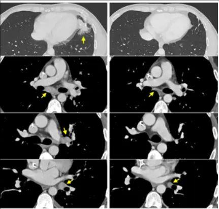 转移性结肠癌患者,支气管镜记录的右肺淋巴管炎受累(顶部,轴向)、腹膜后淋巴结和肝周肿瘤(中和底部,冠状方向)的消退。