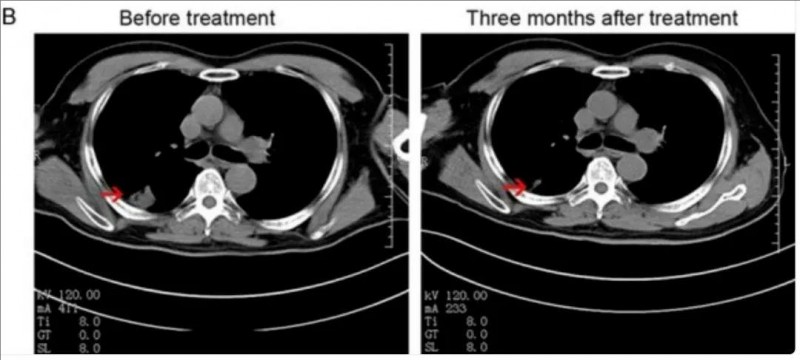 下图展示了2例代表性患者,在CIMAvax-EGF治疗前后的CT变化,能更直观地显示该疫苗对非小细胞肺癌的长期控制效果(详见下图)。