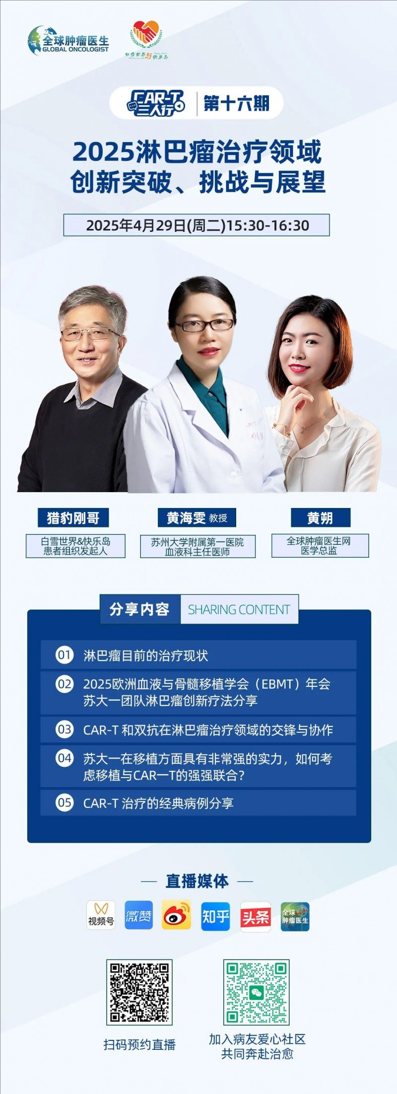 2025年4月29日15:30,《CAR-T三人行》第十六期,特别邀请了苏州大学附属第一医院淋巴瘤病区负责人--黄海雯教授及早期受益于CAR一T治疗的科普达人—白雪世界&快乐岛患者组织发起人--猎豹刚哥共同深度探讨CAR-T疗法在淋巴瘤领域的应用进展,以及2025淋巴瘤治疗领域创新突破、挑战与展望。同时病友们可以在线提问,直播结束后专家将为大家在线解答,机会非常难得,肿瘤病友和家属快报名参加吧!