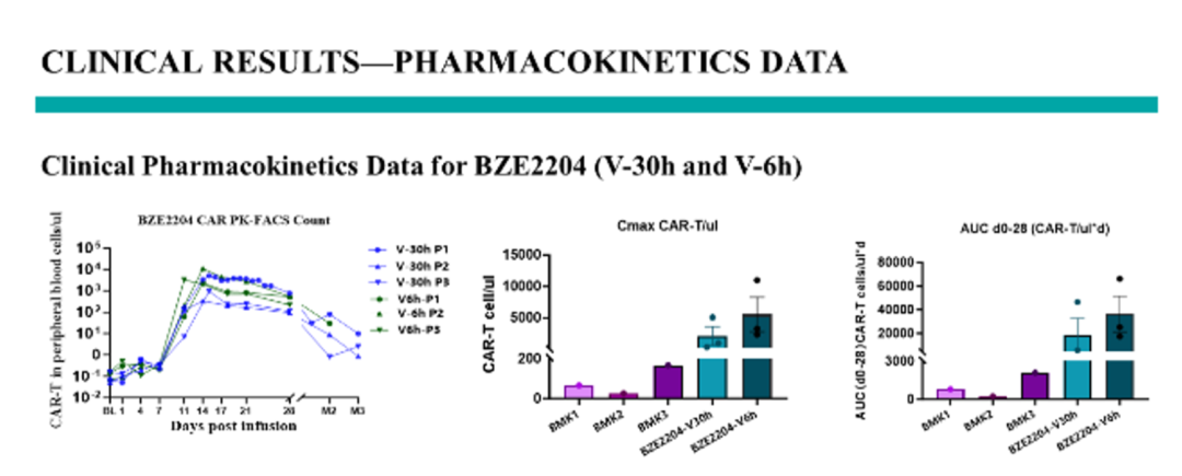 BZE2204体内扩增能力强,以常规市售CAR-T剂量的1/40,达到常规剂量产品30-200倍的 Cmax (CAR-T/ul)、17-150倍的AUC(CAR-T/ul*d)。目前6h工艺开展的IIT临床实验中,在难治复发弥漫大B淋巴瘤(r/r NHL)末线3例患者中达到临床客观缓解率ORR=100%,完全缓解率(CR)近70%(截止发稿时已更新至CR=100%),且毒副作用极小,无三级或以上CRS,无DLT。患者回输后恢复好,持续缓解比例高。