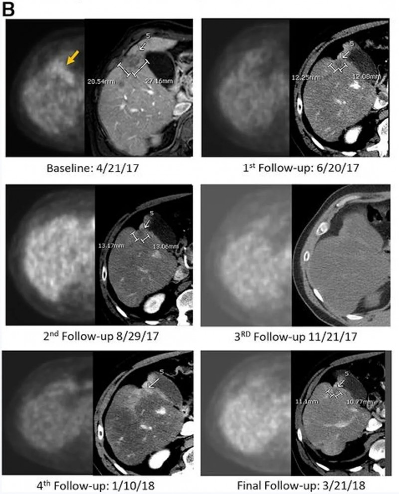 结果显示:接受CAR-GPC3T细胞治疗6个月后,影像学检查提示肿瘤迹象消失(详见下图),肿瘤标志物甲胎蛋白(AFP)也恢复正常。更令人振奋的是,截至2023年8月,该患者已无癌生存8年(始于2015年7月),并逐步回归了正常生活。