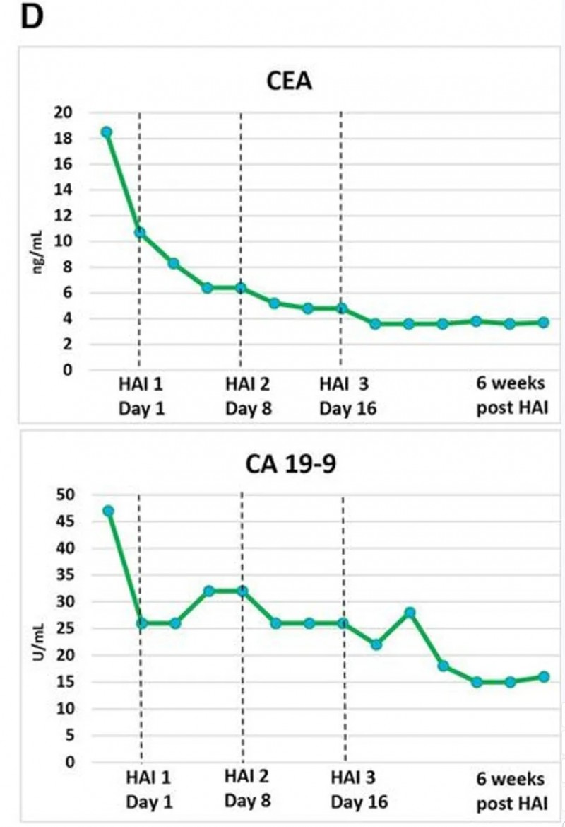 该患者是一位50多岁男性,确诊持续性低分化胰腺腺癌伴肝转移,美国东部肿瘤协作组(ECOG)体能状态评分为0分,曾接受一线标准全身化疗(5-氟尿嘧啶、亚叶酸钙、伊立替康、奥沙利铂,即FOLFIRINOX方案),但均耐药,遂入组接受第二代抗CEACAR-T疗法+低剂量IL-2联合治疗。