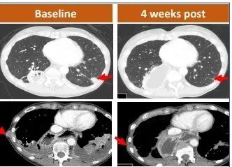 值得一提的是,其中一位62岁胃腺癌女性患者就诊时已出现肺部转移,接受CT041治疗仅4周后,肺部1个靶病灶便完全消失,另外2个病灶显著缩小(详见下图)。