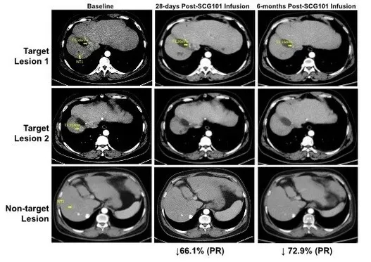 国际细胞与基因治疗大会(ISCT)上公布了SCG101治疗HBV相关肝细胞癌的振奋案例:患者治疗后达成部分缓解(PR),肿瘤缩小74.5%,乙肝感染实现100%清除。