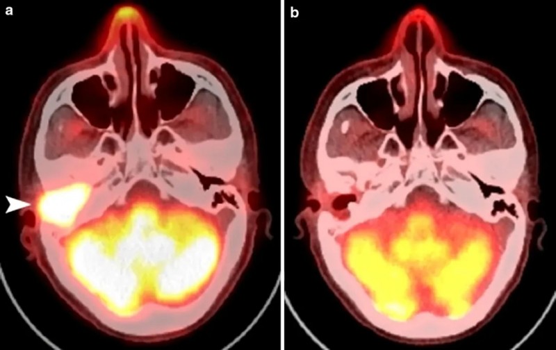 下图为1例鼻咽癌复发患者的治疗效果:该患者曾接受两次根治性放疗和手术,BNCT治疗前影像图显示,小脑前方高信号区域为复发肿瘤(详见下图a,箭头所示);而两次BNCT治疗5个月后,外耳道肿瘤完全缩小(详见下图b)。