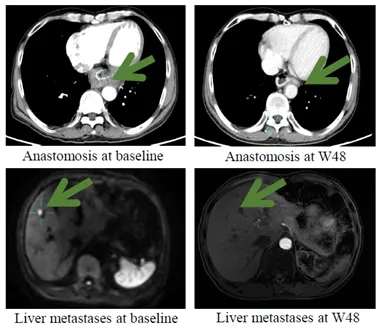 持久完全缓解:一例经多线治疗失败的转移性胃食管结合部癌患者,接受 IMC002 治疗后肝脏及吻合口病灶完全消失,持续完全缓解已达 60 周(超 1 年),至今仍无复发迹象。
