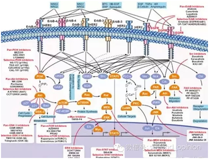 表皮生长因子受体(EGFR)及其家族成员通过调节细胞增生、凋亡、迁移及肿瘤血管生成发挥重要的致癌作用。EGFR信号分子改变涉及多种恶性肿瘤发生、发展。尽管EGFR突变通过何种信号途径致癌的机制还不完全清楚,但明确的是EGFR突变能增强酪氨酸蛋白激酶活性。