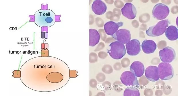 2014年12月3日,FDA加速批准blinatumomab(Blincyto)用于治疗费城染色体阴性,复发或难治性B细胞ALL。图像(左):Blinatumomab链接T细胞与恶性B细胞,来源:Anypodetos,维基共享资源。图像(右):前导B-细胞ALL的骨髓穿刺液涂片,来源:Dybdal,维基共享资源。