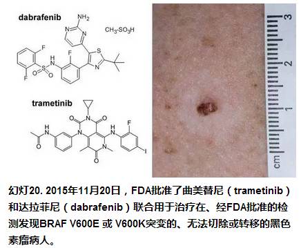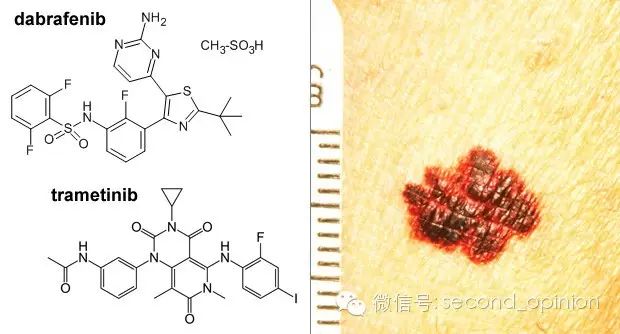 2014年1月10日,美国食品和药物监督管理局(FDA)加速批准曲美替尼(Mekinist)联合达拉菲尼(Tafinlar)用于治疗不能手术切除或转移性的,BRAF V600E或V600K突变的黑色素瘤。