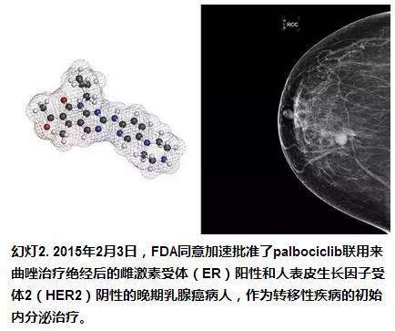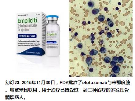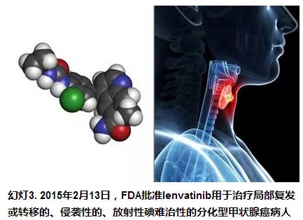 2015年的抗肿瘤新药包括治疗多发性骨髓瘤的4种药物:Darzalex (daratumumab) 、Empliciti(elotuzumab)、Farydak(panobinostat)、Ninlaro(ixazomib);治疗其他部位肿瘤的10种药物:Alecensa (alectinib)、osimertinib (Tagrisso)、Portrazza(necitumumab)治疗非小细胞肺癌,Cotellic (cobimetinib) 治疗转移性黑色素瘤,Lonsurf治疗转移性结直肠癌,Yondelis(trabectedin)治疗软组织肿瘤,Odomzo(sonidegib)治疗进展期基底细胞癌,Unituxin(dinutuximab)治疗高危性神经母细胞瘤,levantinib治疗进展期甲状腺癌,Palbociclib治疗进展期乳腺癌,具体见下文: