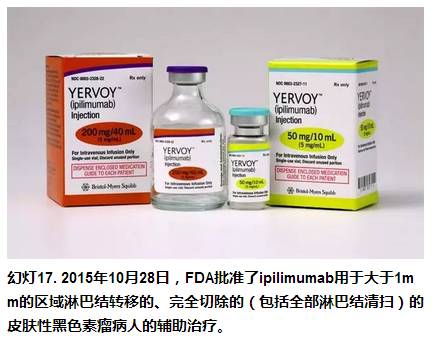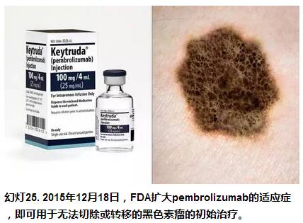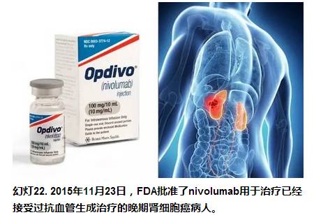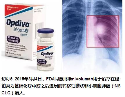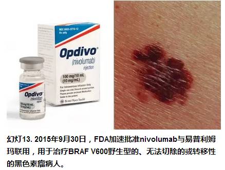 2014年12月22日,FDA加速批准nivolumab(Opdivo)用于治疗对其他药物不应答的,不能手术切除或转移性黑色素瘤。