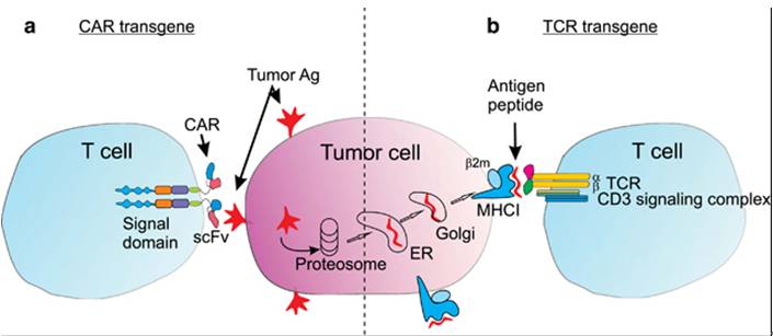 跟CAR-T技术也不一样,虽然看起来很像,具体的操作流程也很像。TCRT技术也是转基因,不过CAR-T转的是一个科学家自己设计的并非天然存在的基因(CAR),而TCRT转的是一个在T细胞中天然存在的基因(TCR)。