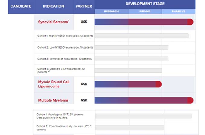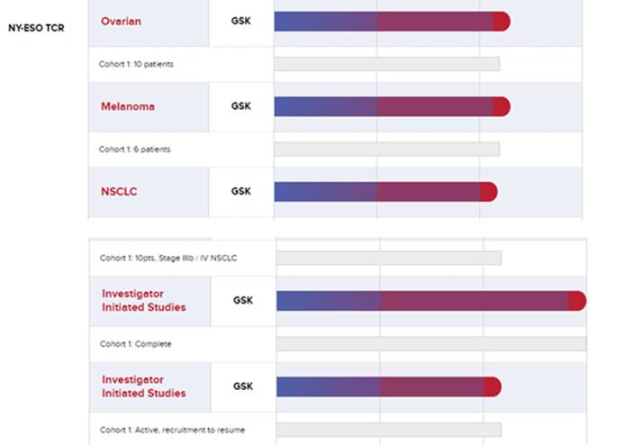 除了NY-ESO-1这个靶点,他们还有针对MAGE-A-10和AFP这两个靶点的TCRT技术,分别针对非小细胞肺癌、黑色素瘤、头颈癌、尿路上皮癌和肝癌等多种肿瘤,都还没有临床数据。下面是他们公司在NY-ESO-1这个靶点的临床试验安排: