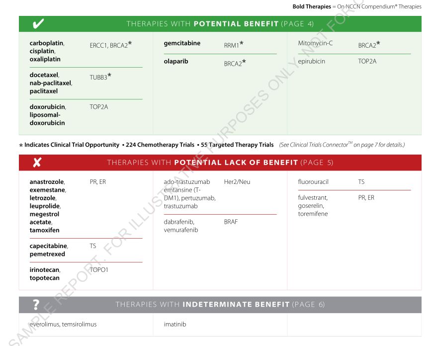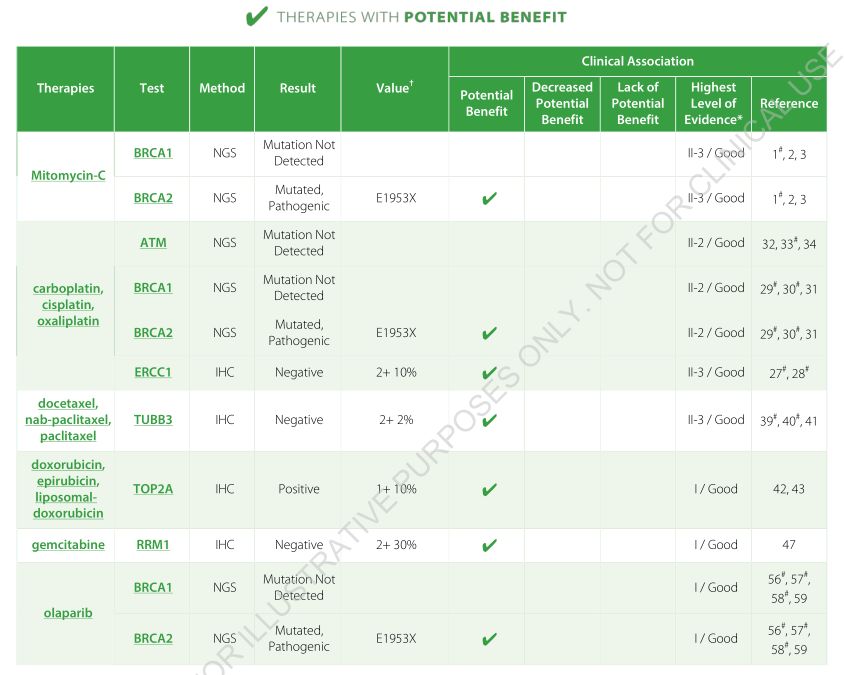 报告还明确指出患者激素受体PR/ER均为阴性,激素治疗无获益;HER2也为阴性,曲妥珠单抗治疗无效;无BRAF突变,达拉非尼与威罗菲尼治疗无效;还有几种化疗药物也是无获益药物:卡培他滨、培美曲塞、伊立替康、氟尿嘧啶等,患者应避免使用这些药物。