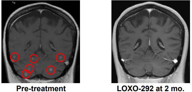 M女士走图无路的情况下接受了基因检测,发现了KIF5B-RET融合,开始接受600 mg BID靶向药 alectinib治疗(PR,7个月),由于脑转移进展增加至900mg BID,后脑转移症状严重,M女士接受了LOXO-292治疗,于是奇迹出现了,治疗两个月后,M女士肺部的病灶明显好转,脑部病灶几乎全部消失!