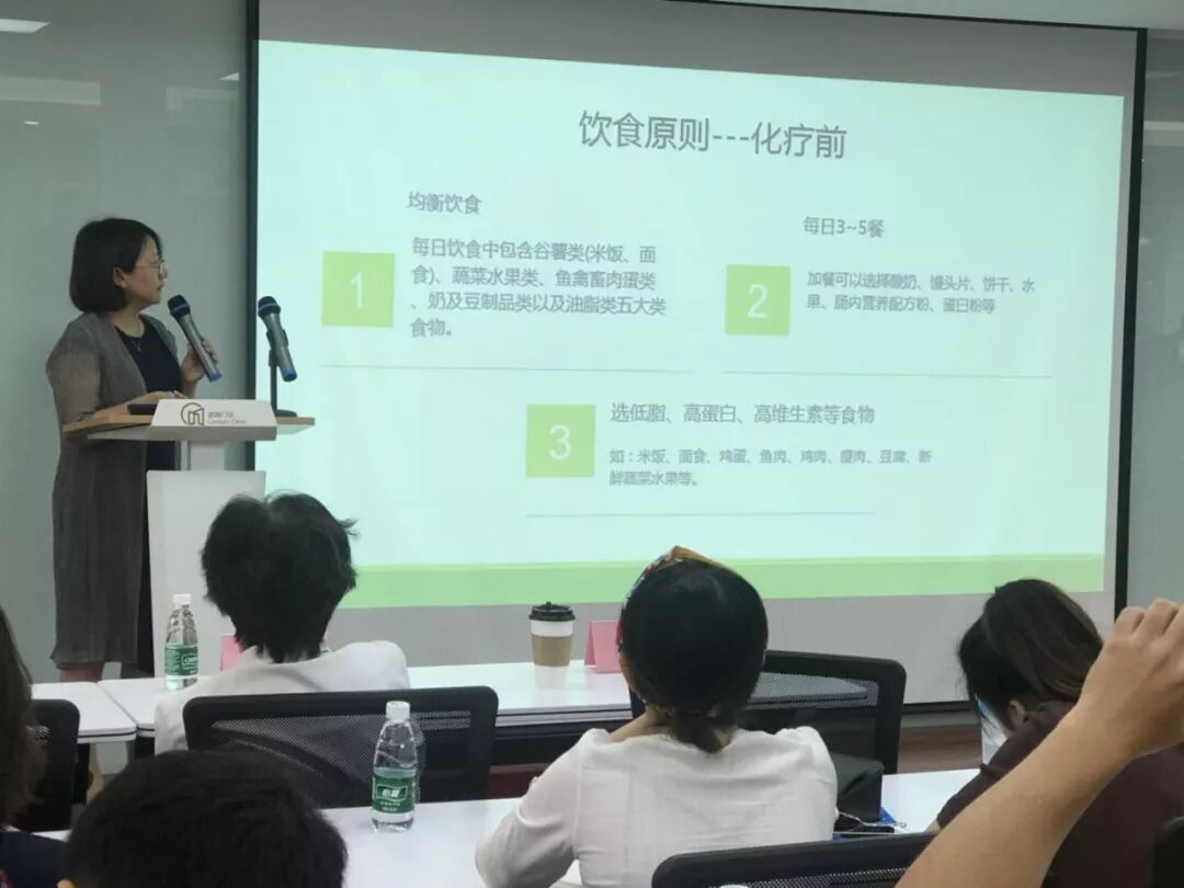 会上,方主任从四个方面给大家讲解了癌症患者营养摄入的重要,分别是肿瘤化疗期间患者的饮食原则、识别和对比几种不同的膳食模式、了解常见的膳食模式对肿瘤康复期患者的影响、了解适合肿瘤患者的膳食模式。无论是放疗还是化疗,副作用的影响都很大,身体的营养再供应不足,癌症患者很难从治疗中恢复,恶心、呕吐是常有的事,但是,不能因为身体不适而忽视进食的讲究。特别是体重迅速下降的患者,一定要找营养科医生沟通食谱搭配,均衡饮食对于患者的康复尤其重要。