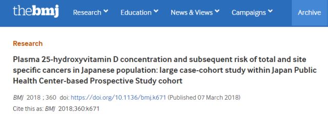 该项研究在JPHC数据中从1990年起至2009年的随访期间,共33736名年龄在40-69之间的男女性参与者的病史,饮食和生活方式的详细资料,同时采集其血液样本来测定体内维生素D的水平,在平均随访的16年中,该人群中出现了3301例新癌症病例。