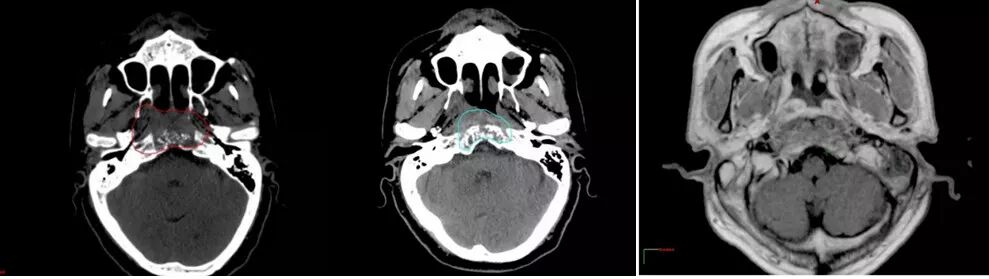 因鼻塞2年余,涕中带血半年,头痛20余天,入院诊断为鼻咽癌(低分化鳞癌)复发,给予质子治疗。治疗1个月后复查(中),肿瘤明显缩小,无不良反应;治疗7个月后MR图像(右),肿瘤缩小70%。