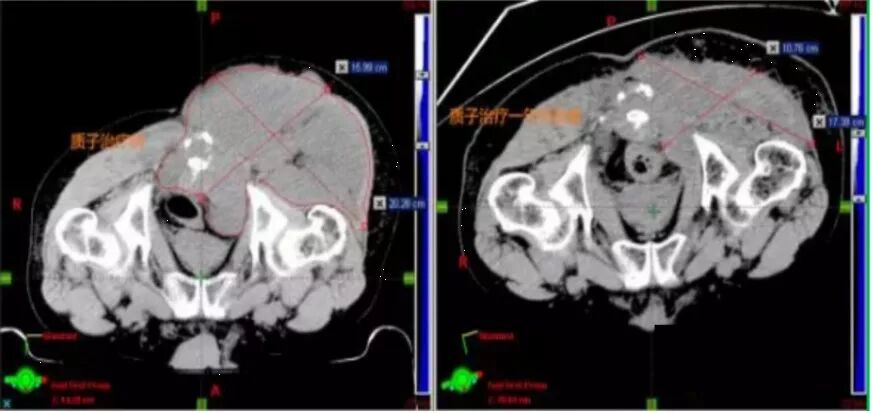 质子治疗一年后复查:肿瘤由原来的16×20.28cm缩小到10.76×17.39cm,局部纤维化明显,直肠恢复到正中,受压明显改善